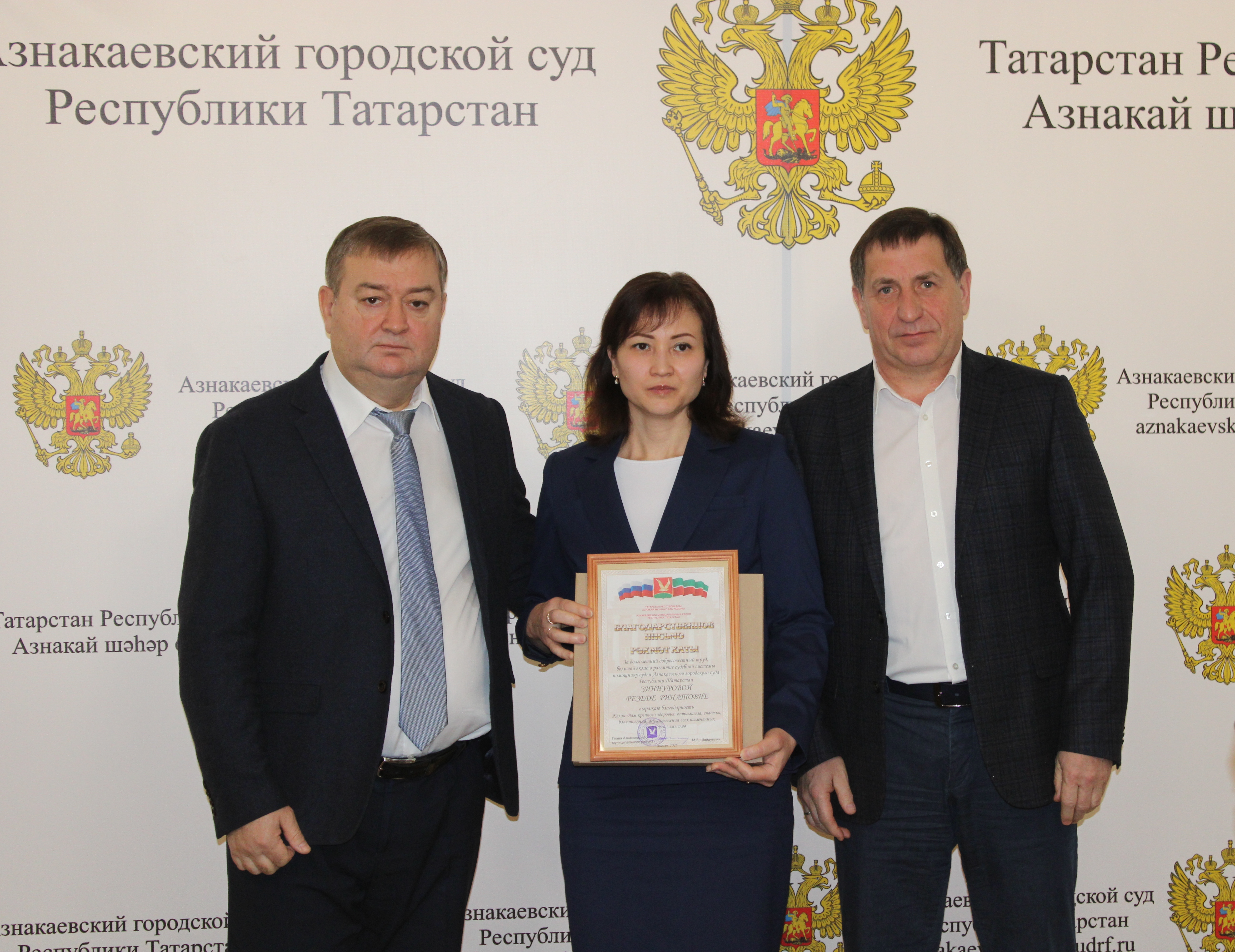 В торжественной обстановке Благодарственным письмом Главы Азнакаевского муниципального района республики Татарстан награждены помощники судей Элина Галеева и Резеда Зиннурова. Председатель суда Ильдар Ирекович Шарифуллин и руководитель исполнительного комитета Азнакаевского муниципального района Айдар Халяфутдинович Шамсутдинов вручили Благодарственные письма Главы Азнакаевского муниципального района помощникам судей Элине Галеевой и Резеде Зиннуровой за долголетний добросовестный труд и большой вклад в развитие судебной системы. Церемония вручения прошла с участием коллективов Азнакаевского городского суда, судебных участков мировых судей и приглашенных гостей. Поздравляем Элину Иршатовну и Резеду Ринатовну с заслуженной наградой и желаем дальнейших профессиональных успехов, высот и достижений, крепкого здоровья, семейного благополучия, добра и мирного неба!