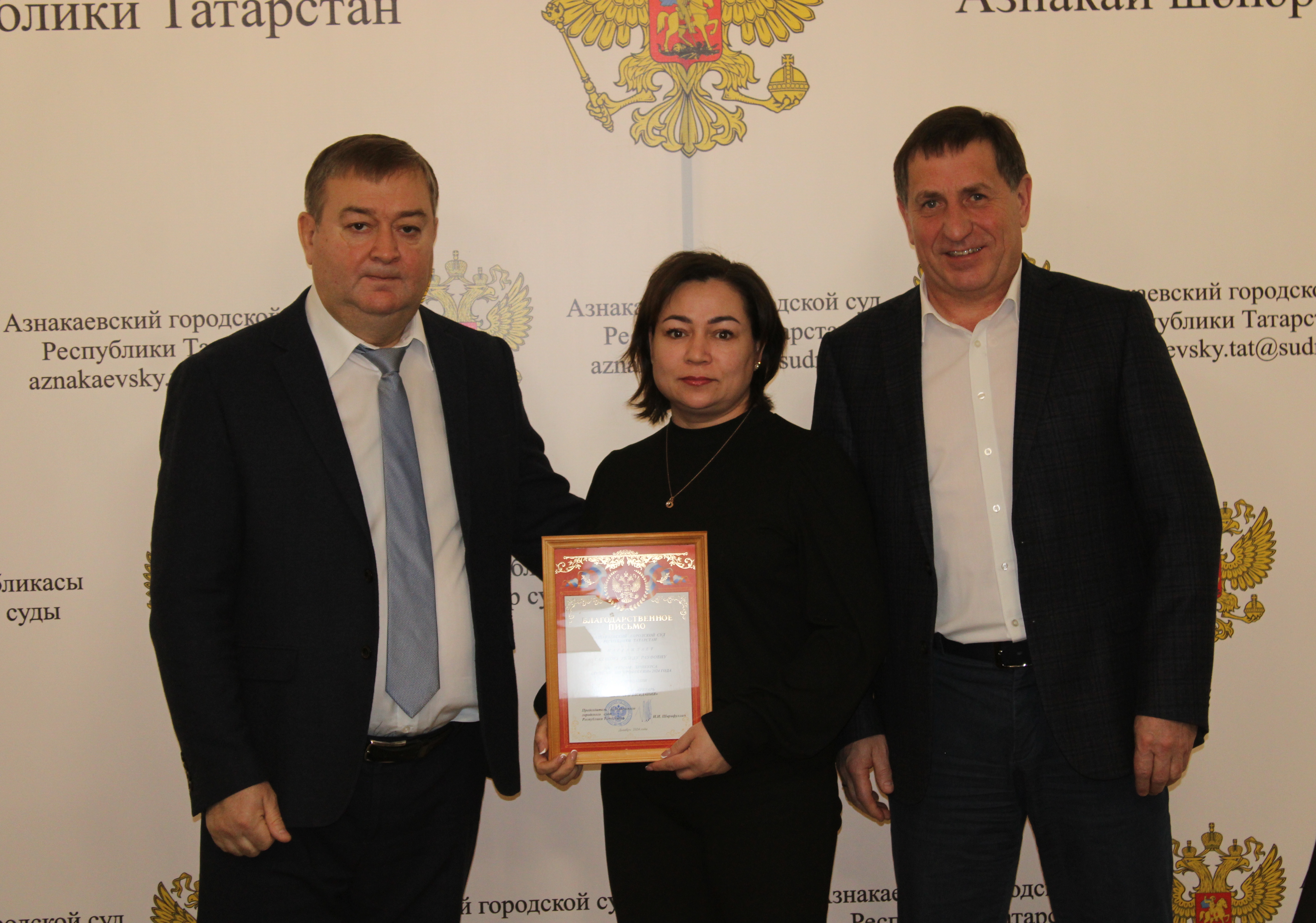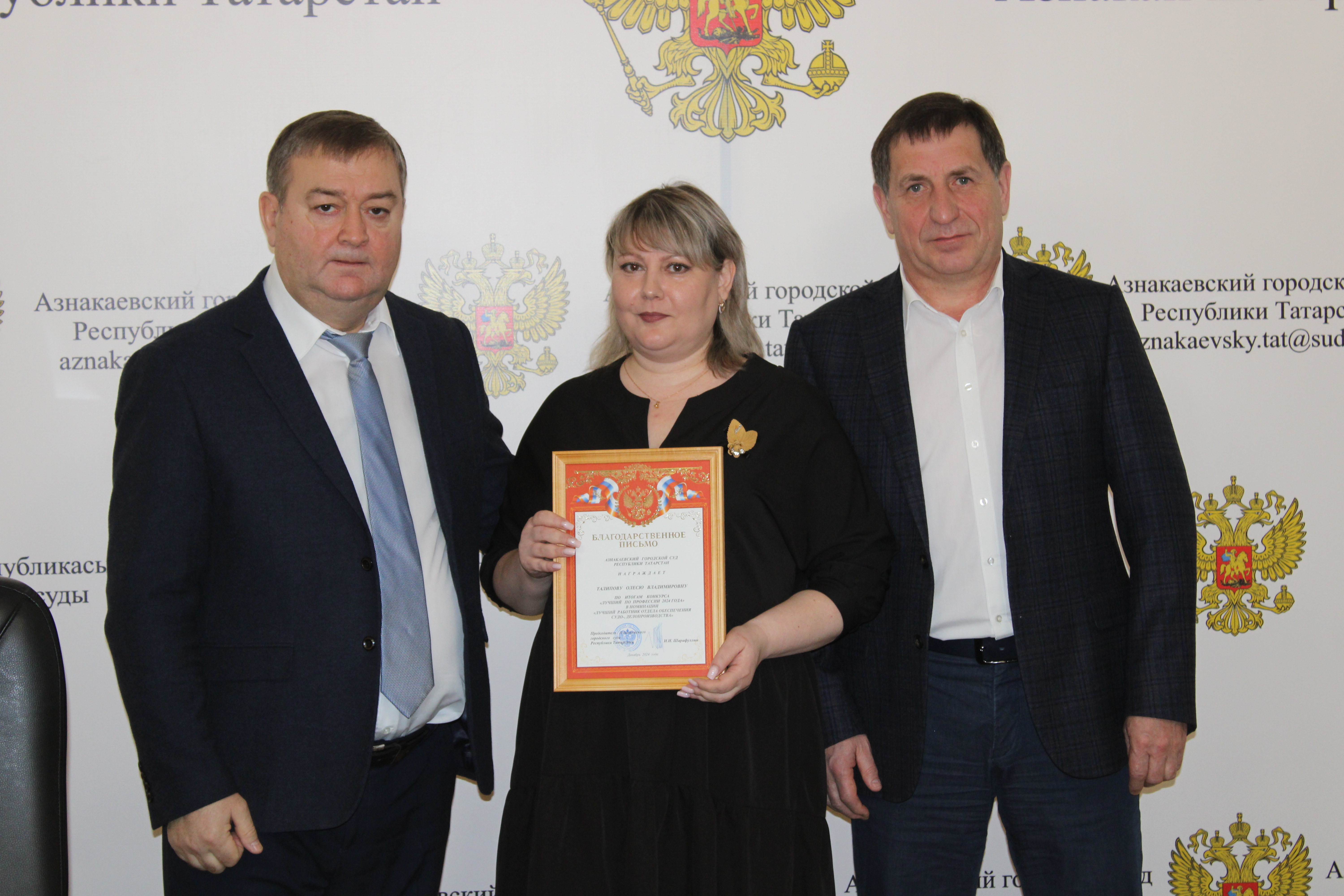 Победители конкурса«Лучший по профессии - 2024» награждены Благодарственным письмом Азнакаевско гогородского суда Республики Татарстан.Председатель суда Ильдар Ирекович Шарифуллин вручил Благодарственные письма Азнакаевского городского суда победителям ежегодного конкурса «Лучший по профессии – 2024»: - Зиннуровой Резеде Ринатовне – помощнику судьи, - Салаховой Резеде Рауфовне – секретарю судебного заседания, - Талиповой Олесе Владимировне – секретарю суда. Церемония вручения прошла в торжественной обстановке с участием руководителя исполнительного комитета Азнакаевского муниципального района Айдара Халяфутдиновича Шамсутдинова,коллективов Азнакаевского городского суда, судебных участков мировых судей и приглашенных гостей. Поздравляем Резеду Ринатовну, Олесю Владимировну и Резеду Рауфовнус заслуженными наградами и желаем им дальнейших профессиональных успехов,достижений и высот, крепкого здоровья,счастья, семейного благополучия и мирного неба над головой! Пресс-центр суда |