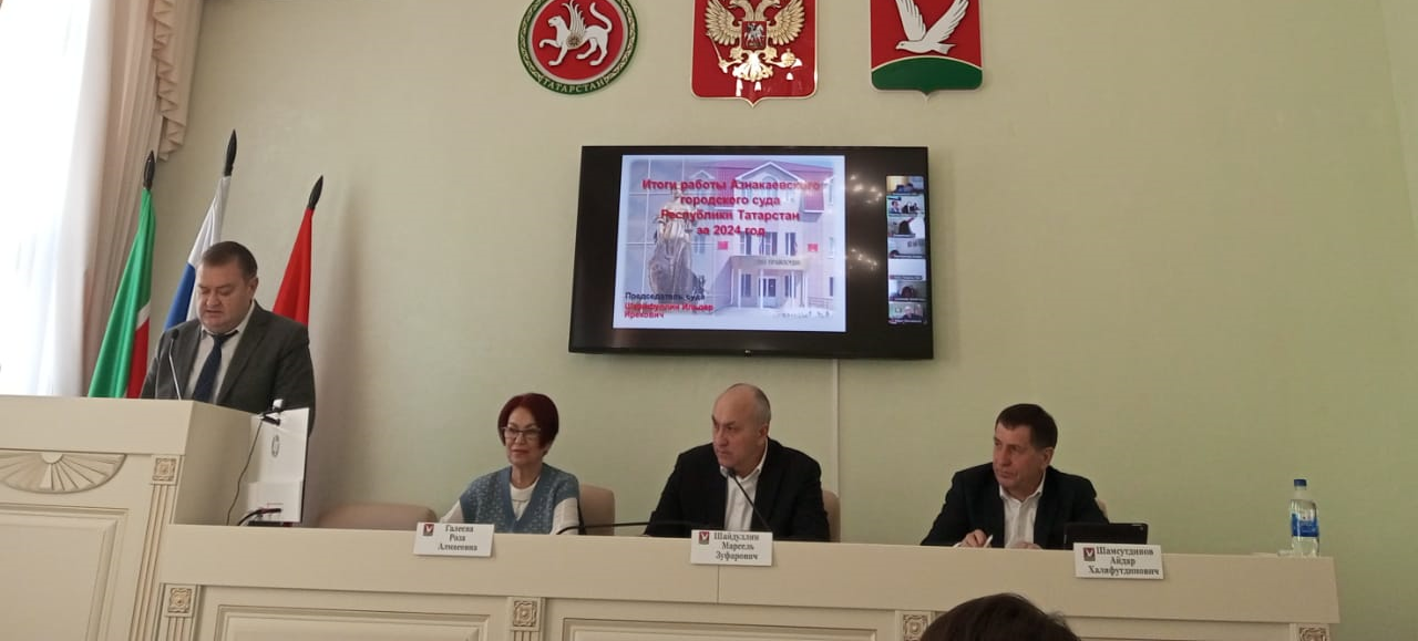 Председатель суда И.И. Шарифуллин выступил на совещании перед руководителями района с участием Главы муниципального образования М.З. Шайдуллина, руководителя исполнительного комитета района А.Х. Шамсутдинова, руководителей местных государственных органов, органов местного самоуправления, общественных организаций, средств массовой информации, предприятий и учреждений с информацией о работе Азнакаевского городского суда и трех судебных участков мировых судей по Азнакаевскому судебному району Республики Татарстан по осуществлению правосудия по итогам 2024 года. Ильдар Ирекович отметил, что в 2024 году деятельность городского суда и мировых судей была направлена на выполнение возложенных конституционных обязанностей по отправлению правосудия, обеспечивая качественное рассмотрение конкретных дел в установленные законом сроки. Анализируя работу городского суда и мировых судей, председатель суда обозначил рост обращений граждан и организаций за судебной защитой. Всего по итогам 2024 года рассмотрено 14 761 дело и материл, что на 1165 дел больше, чем в 2023 году. По сравнению с 2024 годом наблюдается небольшое уменьшение числа уголовных дел, рассмотренных городским судом, всего рассмотрено 192 уголовных дела. Общая сумма ущерба, причиненного преступлениями, составляет 18 935 668 рублей. Из них, 292 839 рублей преступлениями коррупционной направленности. Статистика свидетельствует, что 21% от общего количества рассмотренных дел, рассмотрены по преступлениям против собственности. На втором месте, на протяжении уже 6 лет – нарушение правил безопасности движения и эксплуатации транспорта -15%. Общее количество осужденных лиц составило 166 лиц. Как и в предыдущие годы, основное количество преступлений совершено лицами без постоянного источника доходов. Их доля в общем объеме составляет 59,6%. При этом 42% осуждённых совершили преступление в состоянии алкогольного опьянения, 23,4 % преступлений совершено женщинами. Не уменьшилось количество несовершеннолетних лиц, привлеченных к уголовной ответственности. В 2024 году рассмотрено 6 уголовных дел в отношении несовершеннолетних подсудимых, 3 из которых привлечены к уголовной ответственности. В порядке гражданского судопроизводства городским судом рассмотрено более 1 880 дел и материалов. Как и в прошлые годы, количество удовлетворенных требований, то есть восстановление нарушенных прав сторон, находится на высоком уровне. Из оконченных 1383 гражданских дел, 1098 рассмотрены с удовлетворением требований, что составляет 79,4%, с частичным удовлетворением требований 19,4%. В числе рассмотренных гражданских дел самый значительный рост приходится на дела из категории семейно-брачных отношений, что составляет 48%. Данные цифры свидетельствуют, что проблема семейного неблагополучия в нашем районе на протяжении нескольких лет остается одной из самых актуальных проблем. Возросло количество споров о защите прав потребителей на 73% и составило существенную долю от общего количества рассмотренных гражданских дел искового производства. Доля гражданских дел о взыскании сумм по договору займа либо кредитному договору составило 36,4% от всех рассмотренных дел искового производства. Споры, связанные с приватизированными квартирами, увеличились в 2,2 раза, иски о возмещении ущерба от ДТП, иски о взыскании страхового возме