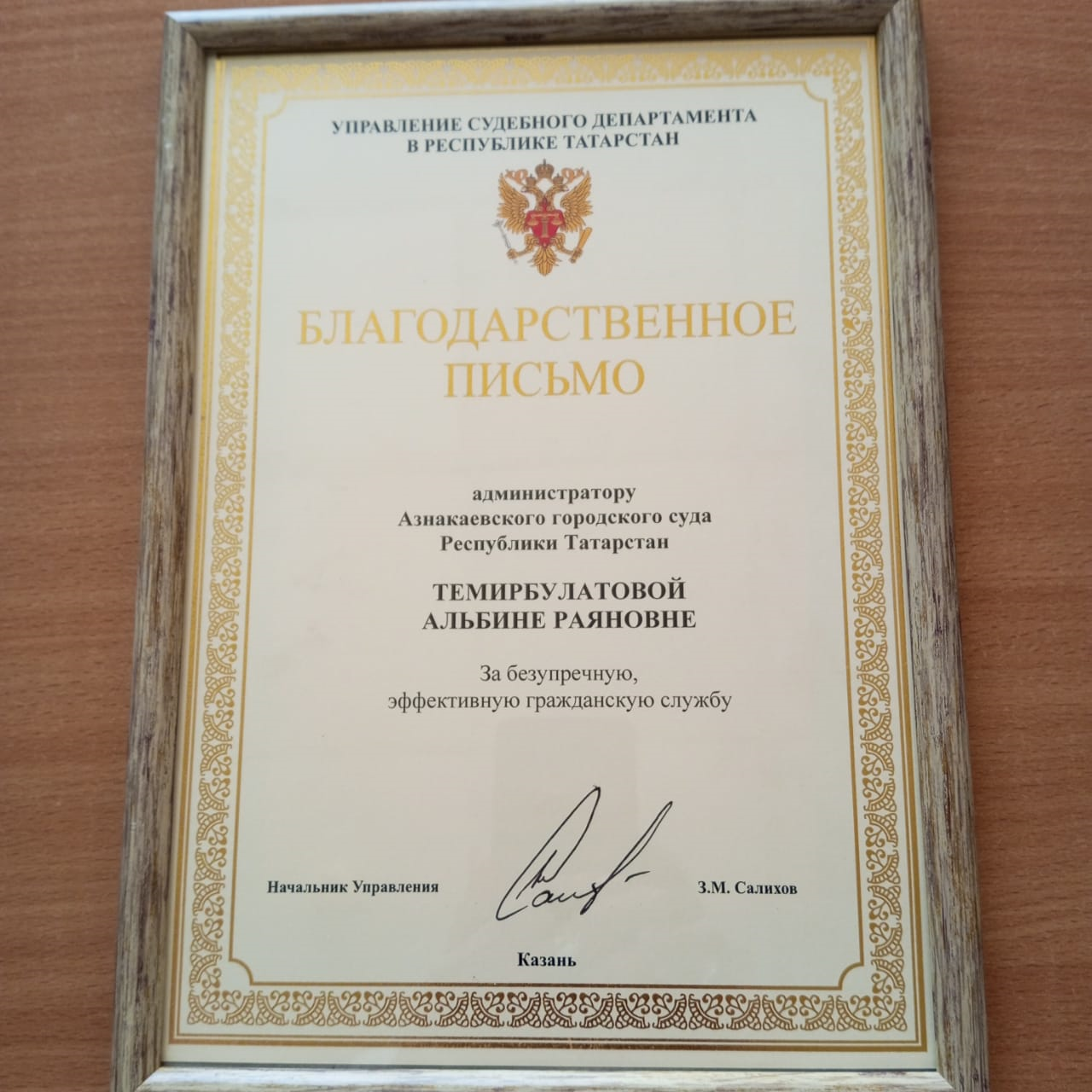| Администратор Азнакаевского городского суда награжден Благодарственным письмом Управления Судебного департамента в РТ | версия для печати |