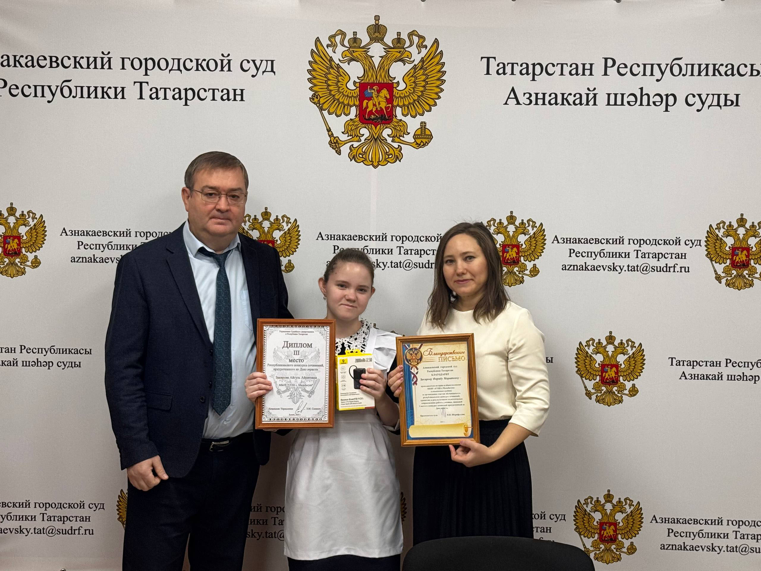 В рамках совместного соглашения о взаимодействии Управлением Судебного департамента в Республике Татарстан, Министерством образования и науки Республики Татарстан и Казанским филиалом Российского государственного университета правосудия имени В.М. Лебедева, в ноябре 2025 года организован Конкурс сочинений, приуроченный ко Дню юриста. 14.01.2026 года в Азнакаевском городском суде РТ председатель суда Ильдар Шарифуллин, в торжественной обстановке наградил Дипломом за третье место в Республиканском конкурсе сочинений, приуроченный ко Дню юриста, Закирову Айгуль Айратовну, ученицу МБОУ «СОШ с.Мальбагуш» Азнакаевского района. Так же отметил работу педагога школы села Мальбагушево, это преподаватель истории и обществознания Закирова Фарида Маратовна. Преподавателю вручено от имени председателя Азнакаевского городского суда «Благодарственное письмо». Целями Конкурса являются расширение и углубление знаний законодательства Российской Федерации; формирование правовой грамотности, воспитание правовой культуры учащихся общеобразовательных организаций республики; повышение эффективности самостоятельной исследовательской работы учащихся в сфере права; воспитание гражданской ответственности и патриотизма детей и молодежи. Пресс-центр суда |